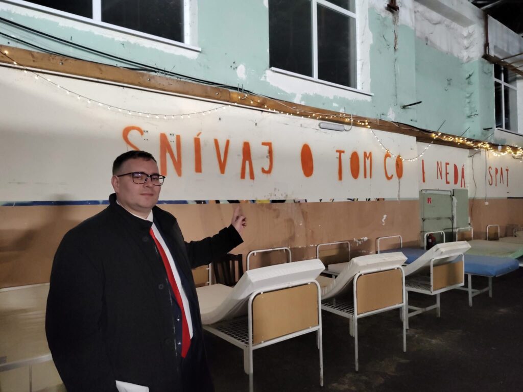 [Popis pre osoby so zrakovým znevýhodnením: Na fotkách sú zachytený verejný ochranca práv v nocľahárni DePaul v Bratislave]