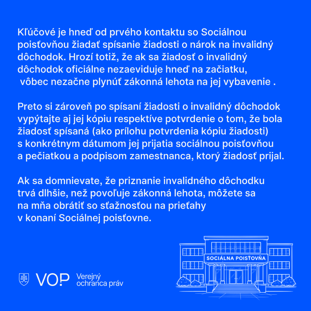 Ak sa domnievate, že priznanie invalidného dôchodku trvá dlhšie, než povoľuje zákonná lehota, môžete sa obrátiť na verejného ochrancu práv so sťažnosťou na prieťahy v konaní Sociálnej poisťovne.